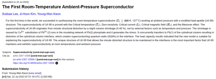 据了解,7月22日上午,韩国量子能源研究中心公司相关研究团队在预印本网站上陆续公布两篇类似的论文,宣称一种命名为LK-99的铜掺杂铅磷灰石材料拥有“室温+常压”超导能力,系全世界首款室温常压超导材料。但其目前公布的实验数据受到质疑,被认为不足以证明LK-99系超导体。目前,国际上多个研究团队正在试图合成LK-99,验证其实验结果。