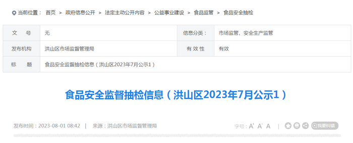 武汉市洪山区市场监管局发布食品安全监督抽检信息(2023年7月公示1)