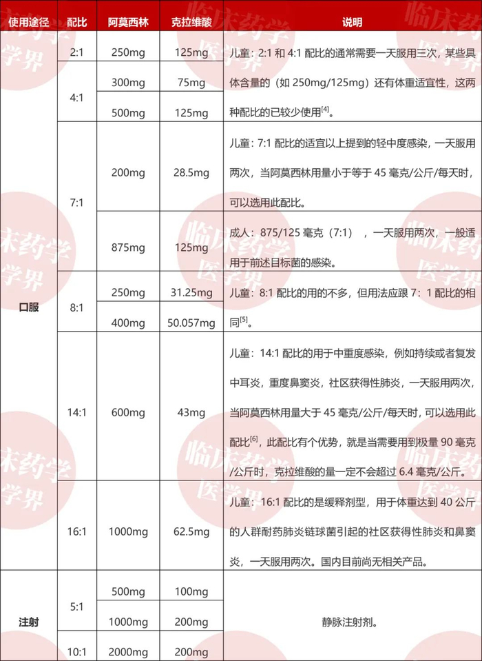 口服阿莫西林/克拉维酸的配比有六种,分别是2:1、4:1、7:1、8:1、14:1、16:1,注射剂型配比有5:1和10:1两种。