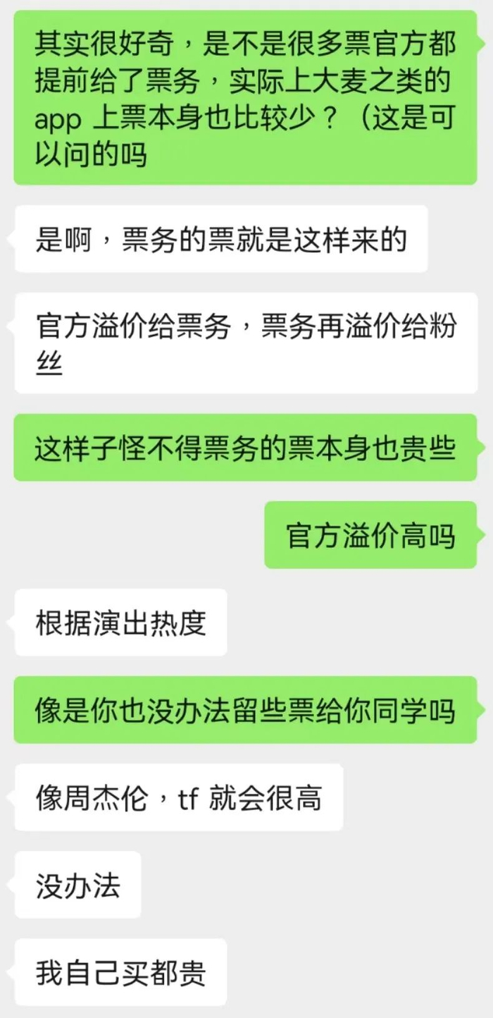“官方溢价给票务,票务再溢价给粉丝。”上述“黄牛”说。多位受访“黄牛”及票务证实了这一说法。阿牛表示,多数时候,官方渠道留给黄牛或票务的一手门票,已经是溢价票,有的票还会成倍溢价。