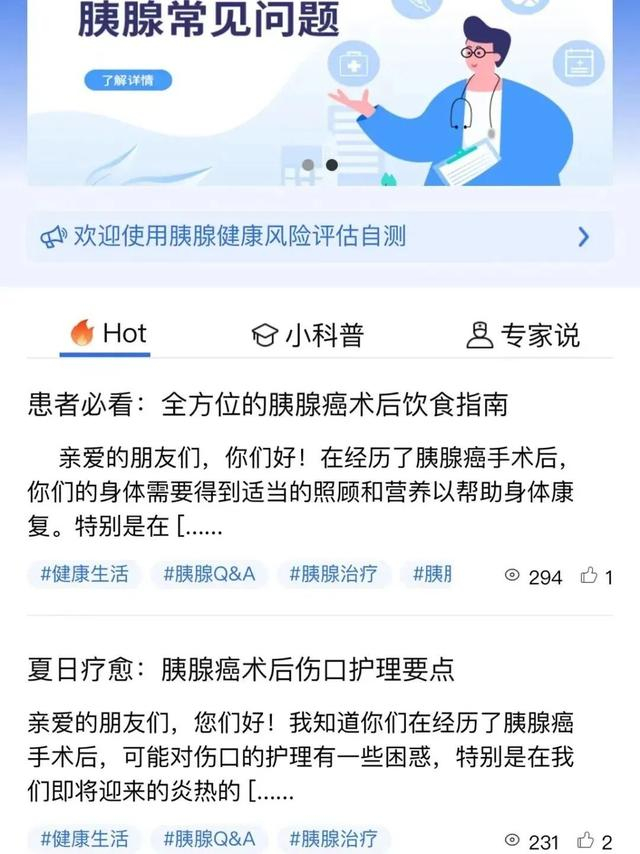 主要有科普视频板块,可以让大家更好的了解胰腺癌,还有“我要说留言板”板块,每一位用户都可以在上面发表自己的留言,最重要的就是还有“我要问—胰问医答”环节,每位用户都可以整理自己的问题向瑞金的医生进行提问,也欢迎大家进行提问,同时每位用户可以进行胰腺癌风险自测,以便于有问题及时就医。