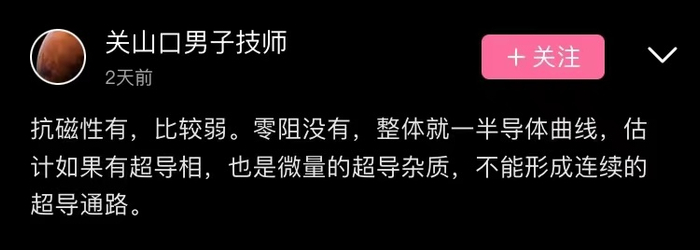 仅在两天前,UP主“关山口男子技师”还在B站上表示,“抗磁性有,比较弱。零阻没有,整体就一半导体曲线,估计如果有超导相,也是微量的超导杂质,不能形成连续的超导通过。”