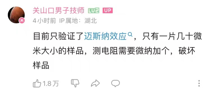 今天终于复现成功。但该UP主也指出,目前只验证了迈斯纳效应,只有一片几十微米大小的样品,若进一步测电阻还需等下一批样品出来。