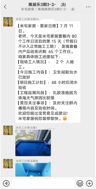 在施工保障方面,米宅家居资深金牌质检团队扎根珠海,严格秉持装修白皮书要求,全流程巡检监督,保障工期及施工品质。还有一对一专属服务群每日监工及播报,向业主实时传达新家装修进展和施工细节。