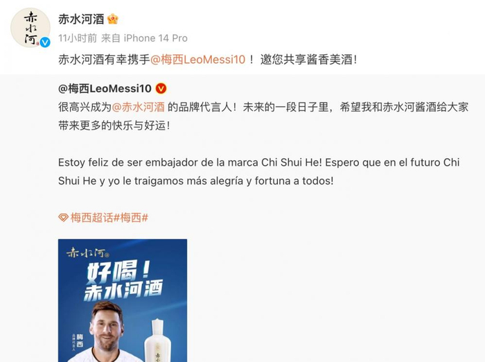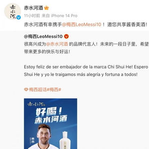 8月1日,阿根廷球星梅西通过实名认证微博发文:“很高兴成为赤水河酒的品牌代言人!未来的一段日子里,希望我和赤水河酱酒给大家带来更多的快乐与好运!”