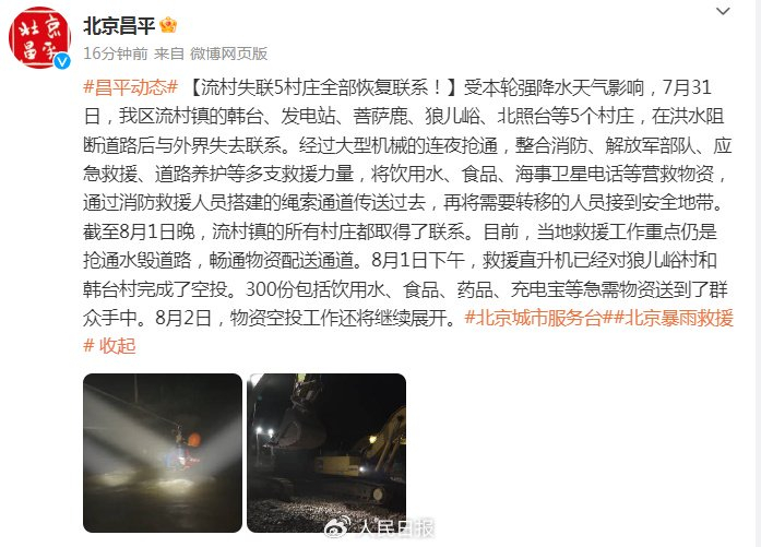 受本轮强降水天气影响,7月31日,昌平区流村镇的韩台、发电站、菩萨鹿、狼儿峪、北照台等5个村庄,在洪水阻断道路后与外界失去联系。经过大型机械的连夜抢通,整合消防、解放军部队、应急救援、道路养护等多支救援力量,将饮用水、食品、海事卫星电话等营救物资,通过消防救援人员搭建的绳索通道传送过去,再将需要转移的人员接到安全地带。截至8月1日晚,流村镇的所有村庄都取得了联系。目前,当地救援工作重点仍是抢通水毁道路,畅通物资配送通道。8月1日下午,救援直升机已经对狼儿峪村和韩台村完成了空投。300份包括饮用水、食品、药品、充电宝等急需物资送到了群众手中。8月2日,物资空投工作还将继续展开。