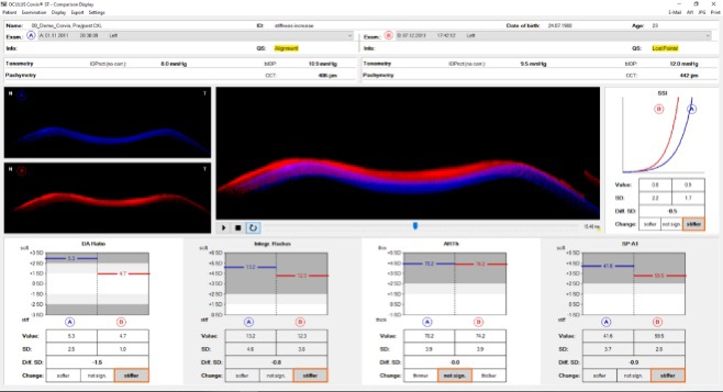 如何能够在早期发现并诊断圆锥角膜呢?异常的近视和散光进行性增加通常是首发症状。在常规屈光随访中,屈光度、角膜曲率、眼轴长度三项指标应当能够相互印证。生理状态下角膜曲率改变较轻微。如果发现近视进展与眼轴长度不能相互协调的情况或散光进行性增加。我们就需要寻找不协调变化的原因。另外对于患有过敏性疾病且高散光的孩子,我们也需要提高警惕。过敏性疾病本身会导致眼表微环境变化,细胞外基质金属蛋白酶分解增强,促进圆锥进展。同时过敏性结膜炎常伴有明显的眼痒,诱使患儿揉眼,揉眼对角膜产生的机械刺激也会导致圆锥进展。遇到以上两种情况,就需要亮起圆锥角膜的警戒灯了。角膜地形图和角膜生物力学检查是我们排查早期圆锥角膜的两大利器。可以在没有发生不可逆视力损伤的极早期阶段,诊断出圆锥角膜。