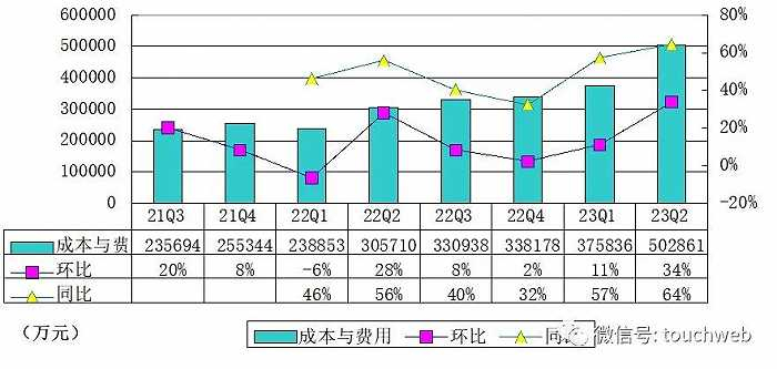 瑞幸咖啡2023年第二季销售和营销费用3.036亿,较2022年同期的1.29亿增135%;总务及行政开支4.255亿,较2022年同期的3.416亿增24.6%。