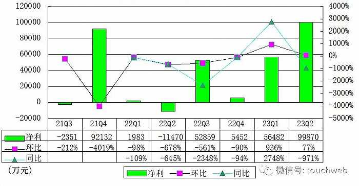 瑞幸咖啡2023年第二季度净利润为9.987亿元,而2022年第二季度净亏损1.147亿元,其中包括为诉讼纠纷拨备的2.768亿元。