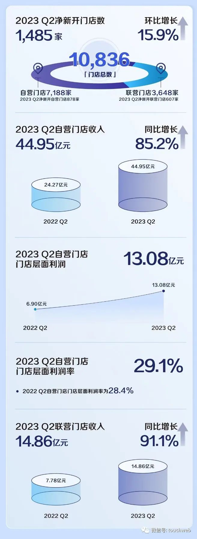 与营收增长同步,第二季度瑞幸咖啡门店规模进一步扩大,净新开门店1485家,总门店数量环比增长15.9%。截至第二季度末,瑞幸咖啡门店总数达10836家,其中自营门店7188家,联营门店3648家。