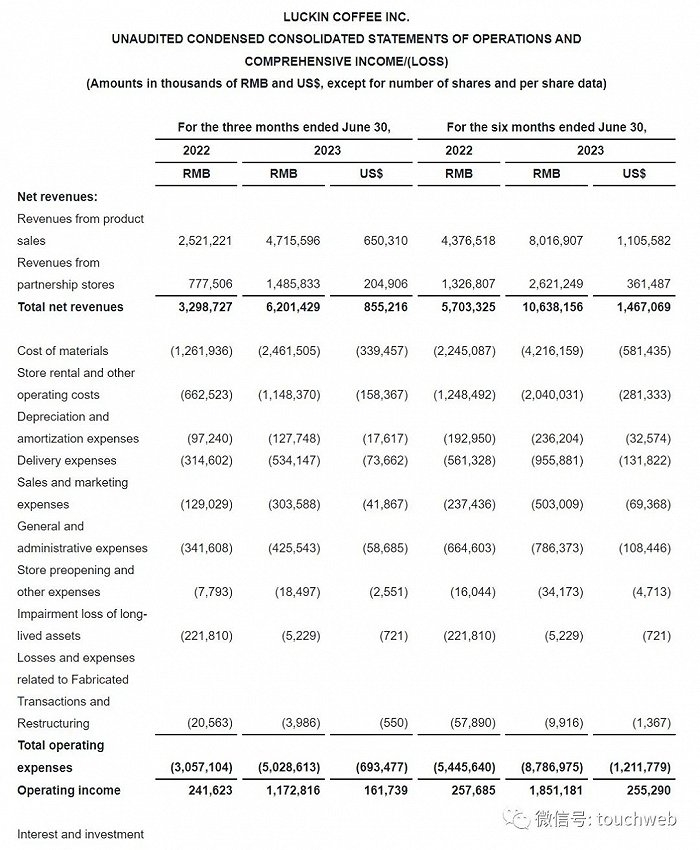 瑞幸咖啡(OTC:LKNCY)今日公布截至6月30日的2023年第二季度财报。财报显示,瑞幸咖啡2023年上半年营收为106.38亿元(约14.67亿美元),上年同期的营收为57亿元。
