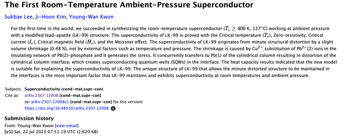 7月22日,韩国量子能源研究中心的团队在arXiv上发布两篇论文,宣布成功合成了世界上第一个室温常压超导体,即在常压条件下,一种改性的铅-磷灰石(命名为LK-99)能够在127℃(Tc≥400k)以下表现为超导体。