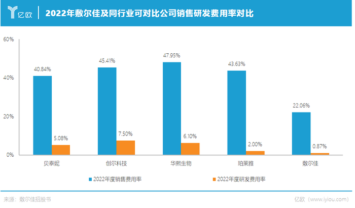 以同行业可比公司来看,贝泰妮、创尔生物、华熙生物2022年研发费用率分别为5.08%、7.49%、6.10%。即便屡被诟病研发不足的珀莱雅,研发费用率也达到了2%。