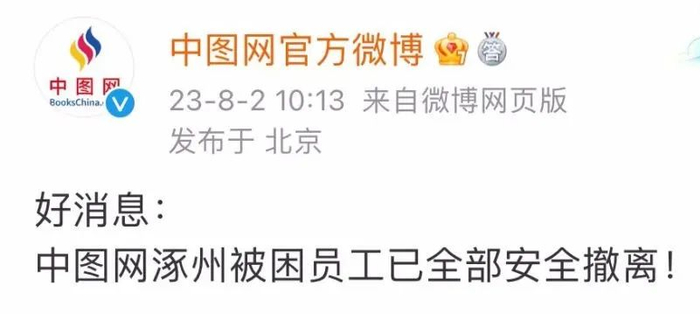 8月2日10时13分,@中图网官方微博 发文表示,“好消息:中图网涿州被困员工已全部安全撤离。”