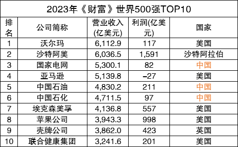 沃尔玛连续第十年成为全球最大公司。沙特阿美首次上升至第二位。中国的国家电网公司继续位列第三。排在第四和第五位的分别是亚马逊和中国石油。