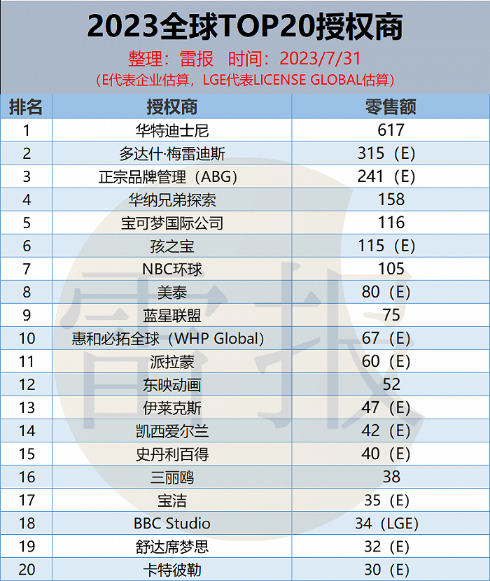 近日,全球授权展旗下授权行业杂志《LICENSE GLOBAL》发布了《2023年全球顶级授权商排行榜》,雷报对该报告进行了翻译和整理。