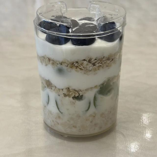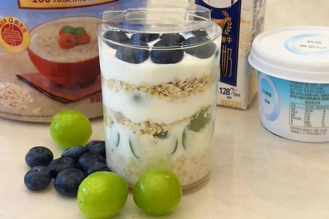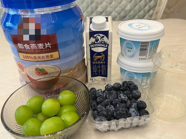 即食燕麦片、酸奶、牛奶、青葡萄、蓝莓、一个密封杯。