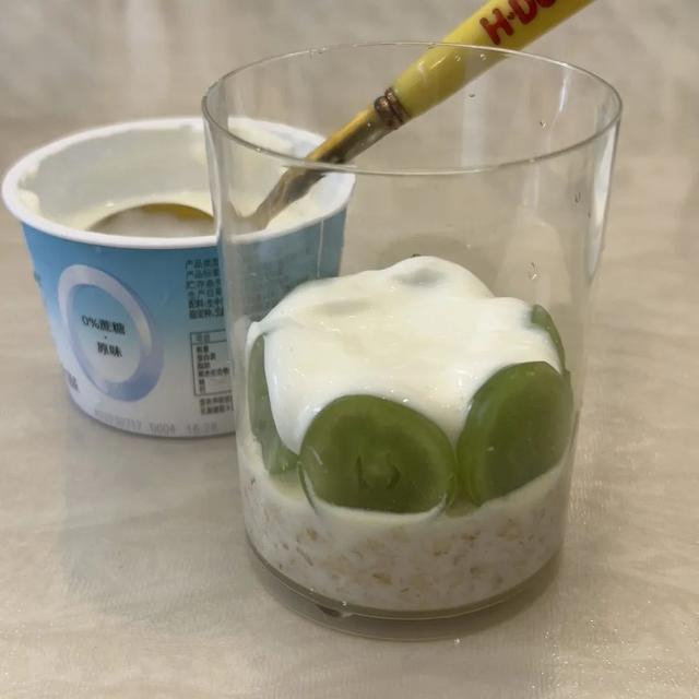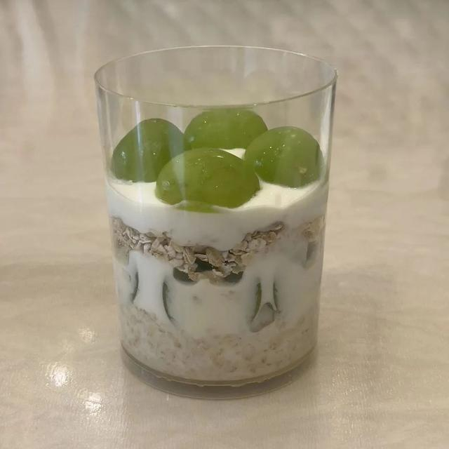 2.葡萄对半切开,环绕杯子内侧铺开,加一层酸奶,加一层燕麦片,再加一层酸奶。水果可按自己喜好随意替换。