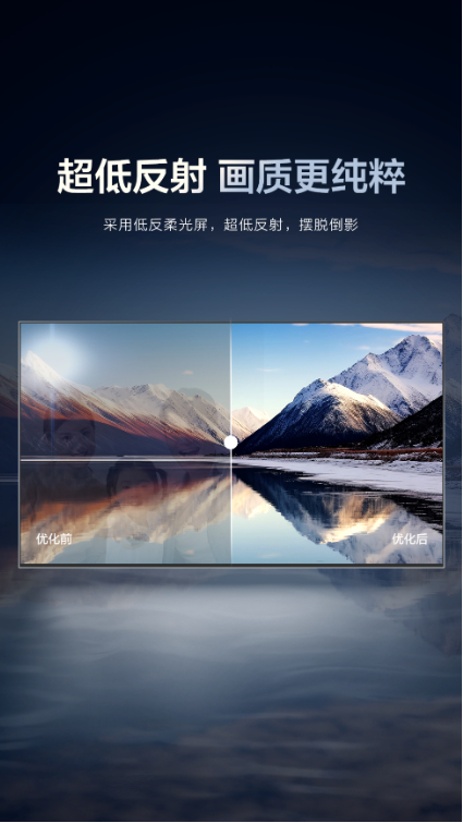 尽管画质表现已经是行业天花板级别,但TCL华星仍秉持着以人为本的产品设计理念,在保证行云流水般视觉体验的同时,还有效保护用户视力健康。为解决传统电视屏幕反光造成的视疲劳问题,TCL华星应用全球领先的低反柔光屏技术,对显示屏幕进行特殊表面处理,将总反射率控制在极低水平,不仅能令画面深邃沉浸,同时大幅减少环境光反射对人眼的刺激,实现健康护眼。