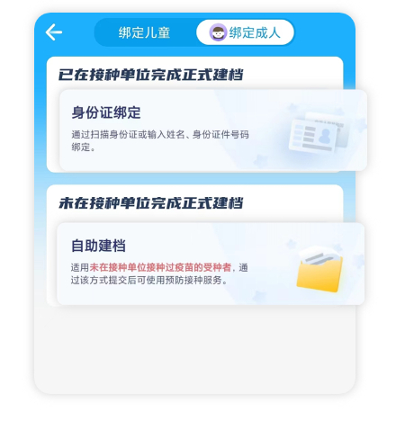 若已在接种单位完成正式建档:输入身份信息进行【绑定】