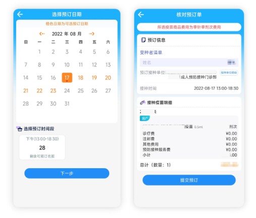 9、选择疫苗接种时间,提交预订。接种当天在门诊出示身份证进行接种(预订成功后,可在 我的--成人接种-成人疫苗预订单 中查看预订订单)