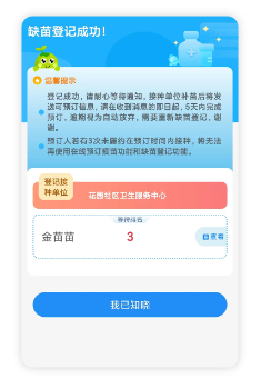 居民只能在金苗宝绑定的居住地内的预防接种门诊进行预约,预约登记时间为当日10时开始至次日10时结束。数量有限,约完为止。预约登记成功后,请留意到苗通知,在收到系统发送的到苗通知后,需在5天之内预约接种,预约时间为当天到未来的15天内任意一个门诊日,过期作废。首针预约成功后,第二、三针次不再预约,只需按工作人员排好的接种时间进行接种即可。