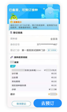 8、收到到苗通知后,点击【去预订】,选择疫苗接种时间