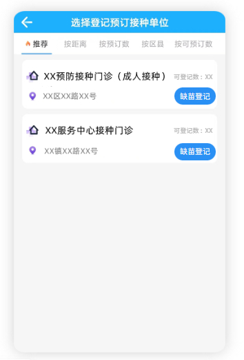 5、选择疫苗接种门诊,点击【缺苗登记】进行登记