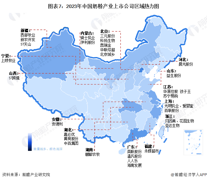 从注册地来看,在奶粉产业链上的上市企业中,位于北京和广东地区的上市企业较多,但从各地的奶粉中游企业占比来看却不如新疆、内蒙古等地高。