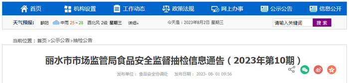 浙江省丽水市市场监管局发布2023年第10期食品安全监督抽检信息