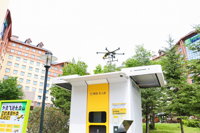 8月2日,搭载着外卖箱的无人机在长白山万达国际度假区稳稳升空,几分钟后,位于1公里之外度假区露营地的游客,从降落的无人机上取下餐食,开始在天幕下享受美食……