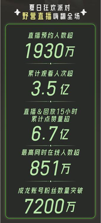 据战报显示,成龙夏日狂欢派对直播间累计观看人次超3.5亿,最高同时在线在观看人数超851万,有超过1930万快手用户成功预约此次的“野营谈唱会”。而在直播期间,成龙的快手账号粉丝数飙升,新增1000多万粉丝。截至目前,成龙的快手账号粉丝量已突破7200万,成为当前快手站内粉丝量最多的明星账号。不管是大家心目中当之无愧的“大哥”,还是快手老铁更喜欢称呼的“龙叔”,成龙在快手用真心广结天下老铁。