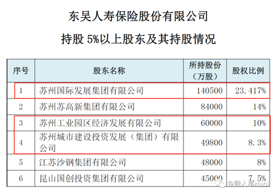 据了解,苏州银行和东吴人寿的第一大股东同为苏州国际发展集团有限公司,而后者是江苏省人民政府核准的国有资产投资主体,是以金融投资控股为主业的地方国有独资企业,东吴证券、苏州信托、苏州资管等均在其金融业务版图之内。