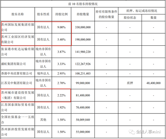 公开资料显示,东吴人寿和苏州银行的前十大股东中有三家一样,且均为国有法人(如下图所示)。其中,苏州国际发展集团有限公司持股苏州银行9%,持股东吴人寿23.417%,是两家的第一大股东。