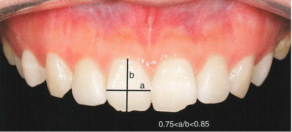 前牙形态比列:从正面观察上颌牙齿之间的比例基本符合黄金分割比例时,能达到最佳的美学效果,中切牙宽度:侧切牙宽度:尖牙宽度=1.618:1:0.618。