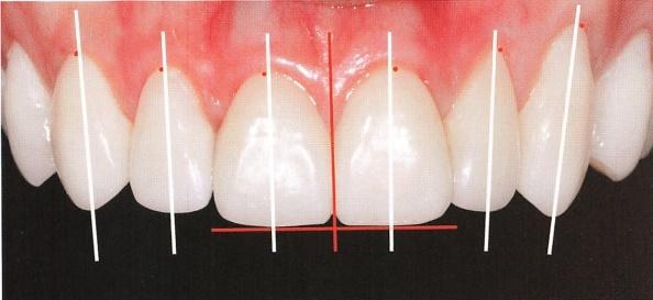 前后有序,大小有别的牙齿连续排列呈抛物线的弓形即是一种自然的排列美。与中线相比,上前牙的长轴通常表现为切端向近中而根尖向远中的倾斜,这种冠部向中线集中而根部背离的量,中切牙最小,尖牙最明显。两侧牙的牙长轴呈镜面对称关系。