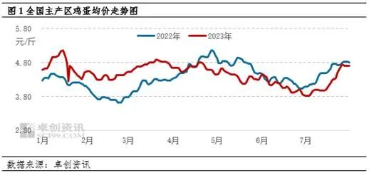 7月受高温高湿天气影响,蛋鸡产蛋率和蛋重均有所下降,大码鸡蛋供应偏紧,加之南方陆续出梅,市场需求明显提升,鸡蛋价格涨势明显。8月虽理论在产蛋鸡存栏量有所增加,但高温天气影响仍存,产蛋率及蛋重暂难恢复到正常水平,大码鸡蛋供应或依旧偏紧,加之学校开学以及中秋节备货提振,鸡蛋价格或继续上行。