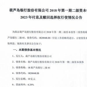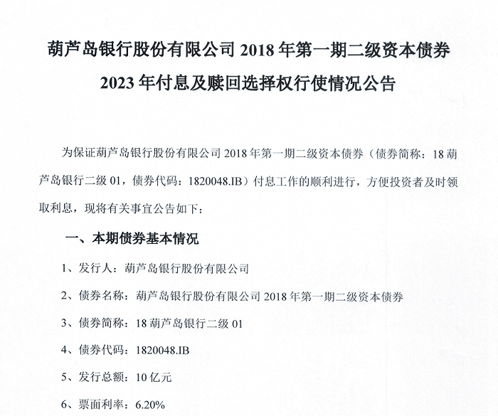 近日,葫芦岛银行在中国债券信息网发布信息显示,该行对其2018年第一期二级资本债券(以下简称18葫芦岛银行二级01)“不行使赎回权”。