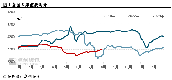 上半年废钢铁市场整体呈现了先涨后跌的运行趋势,上半全国6-8厚重废年均价为2734元/吨,较2022年上半年均价3313元/吨,下跌17.48%。7月废钢铁市场整体呈现趋强的走势,虽然当月中也有震荡起伏,但就价格而言,均价较上月有所上涨。7月6-8厚重废均价在2630元,较6月份上涨57元/吨,涨幅2.2%。那么7月份废钢铁价格上涨的主要原因还是需求方面有所扩大。