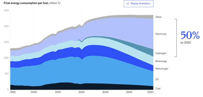 未来,能源结构将迅速向电力、合成燃料和氢转变,到2035年将占全球能源结构的32%,到2050年将占50%。
