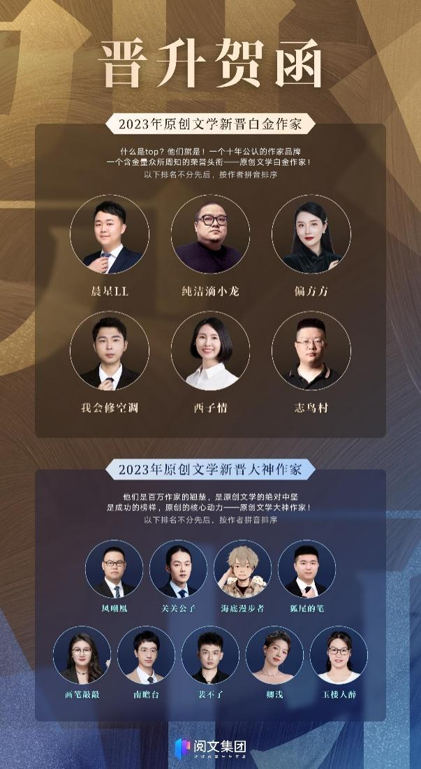 新京报讯 近日,阅文集团发布2023年新晋“白金大神”名单。其中,晨星LL、纯洁滴小龙、偏方方、我会修空调、西子情、志鸟村等6名作者获得“白金作家”称号,凤嘲凰、关关公子、画笔敲敲、海底漫步者、狐尾的笔、南瞻台、裴不了、卿浅、玉楼人醉等9名作者摘得“大神作家”荣誉。至此,阅文旗下白金大神作家人数达458位。