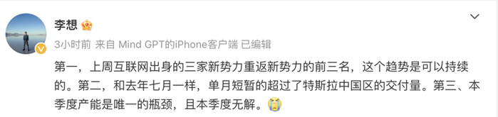 但“凡尔赛本赛”理想汽车创始人李想,并没有在微博上大办特办,而是严肃的点到了交付量背后值得关注的三件事——“第一,上周互联网出身的三家新势力重返新势力的前三名,这个趋势是可以持续的。第二,和去年七月一样,单月短暂的超过了特斯拉中国区的交付量。第三、本季度产能是唯一的瓶颈,且本季度无解。”