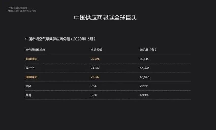 好在,结果喜人。据盖世汽车研究院的数据,今年1-6月,孔辉和保隆分别为中国空簧市场第一和第三,总份额超过60%。这两家国产供应商,已经把德国供应商挤下了神坛。同时,随着车企和供应商的共同成长,空气悬架的成本下探也是肉眼可见的,据本土供应商透露,目前价格已经是国外供应商的70%。空悬大规模普及,或许只是时间问题。