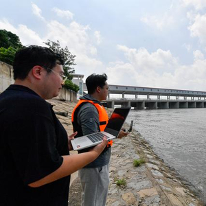 ▲8月2日,在天津市独流减河进洪闸上游,水文人员操作无人水文监测船进行水文监测。图/新华社