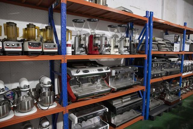 各种品牌的二手咖啡机堆满了仓库的货架。