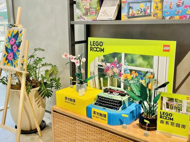 森系花园房展台以乐高繁花、花束、兰花等热门花植系列套装为主体,搭配一款外形复古优雅的乐高ideas打字机,让整体空间静谧而温馨。
