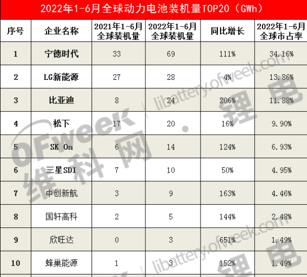 就中国电池企业的整体表现来看,除了宁德时代和比亚迪,入围前十的还有中创新航、亿纬锂能、国轩高科和欣旺达四家。六家中国企业的整体市占率达到了62.6%,相较于去年的56.7%大幅上升了5.9个百分点。