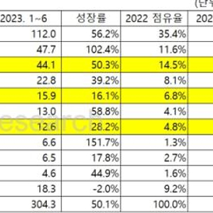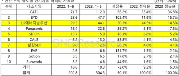 相较而言,2023年1—6月韩国三家公司LG新能源、三星SDI和SK on 市场占有率23.9%,比去年同期下降了2.2个百分点,但三家公司的电池装车量均呈现增长趋势。LG能源44.1GWH与去年同期相比增长50.3%,排在第三位,SK on装车15.9GWH,同比增长16.1%,三星SDI装车12.6GWH,同比增长28.2%,分别排在第五位和第七位。