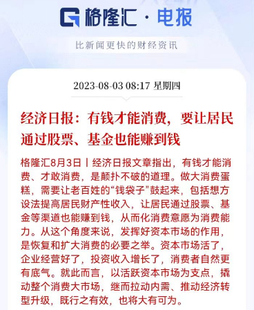 经济日报发文指出,“有钱才能消费,才敢消费,要让老百姓的钱袋子鼓起来,让居民通过股票、基金也能赚到钱”。