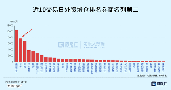 再看外资,配置券商也是非常积极的。截止8月2日的10个交易日之内,外资增仓券商板块高达77.55亿元,仅次于白酒板块。其中,东方财富、中信证券、同花顺是加仓排名前3的龙头。